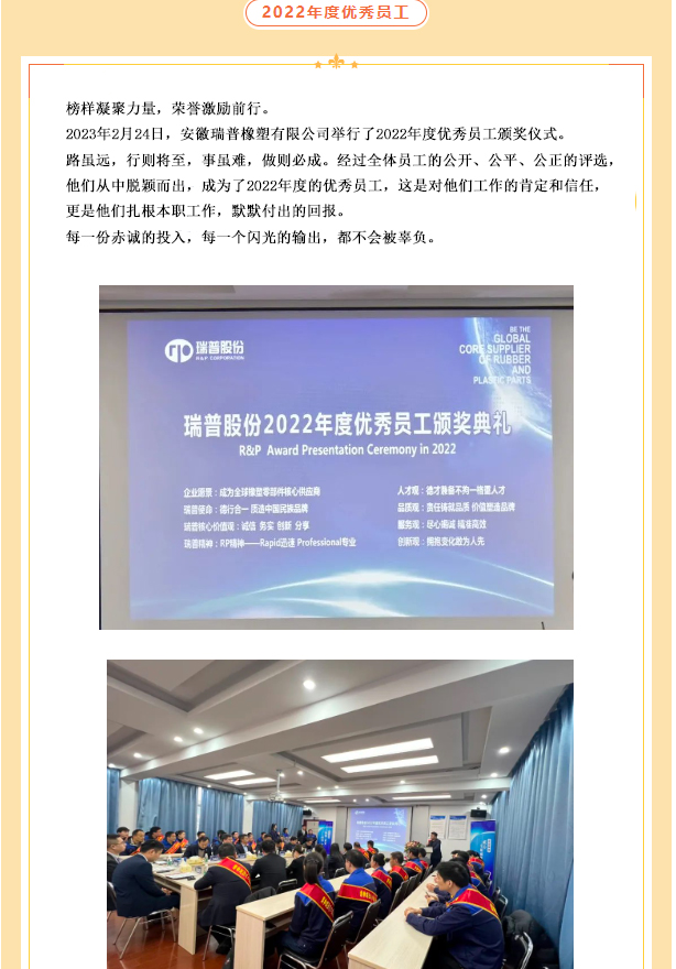 董事長對各部門、子公司負(fù)責(zé)人的2022年度總結(jié)及2023年度工作規(guī)劃進(jìn)行分析,對大家疫情期間的工作予以肯定,并對其薄弱與不足之處提出改進(jìn)意見。2023年公司將圍繞開拓新市場、項(xiàng)目管理制度、事業(yè)部智能化制造、員工工作能力、公司管理制度等方面進(jìn)行提升。努力為員工提供更好的福利待遇,為客戶提供更優(yōu)質(zhì)的服務(wù),為實(shí)現(xiàn)瑞普成為全球橡塑零部件核心供應(yīng)商的企業(yè)愿景而不懈努力!