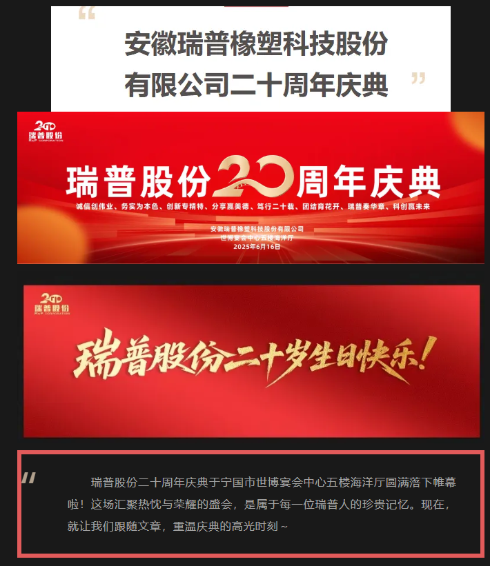 二十載櫛風(fēng)沐雨,二十載砥礪前行。值此安徽瑞普橡塑科技股份有限公司成立二十周年之際,我們滿懷感恩與喜悅,誠邀您撥冗出席二十周年慶典活動,共同見證這一榮耀時刻,共敘情誼,共謀未來!